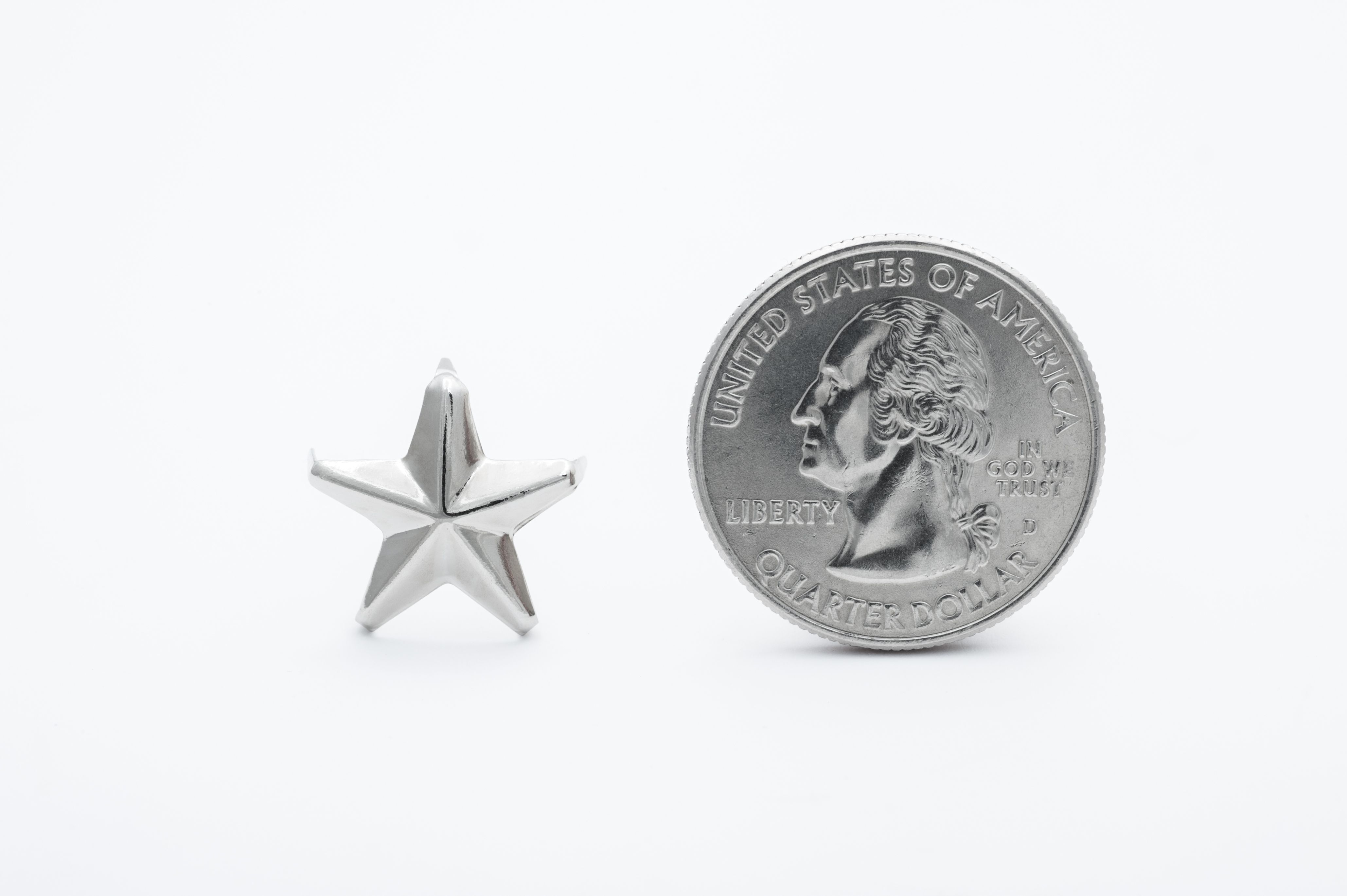 This attractive silver star stud spans almost 5/8 inches from point to point, this 5 star silver stud is very cool looking. This stud is designed for a lighter material like thin leather or cloth, but can be used on almost anything. It has 5 point star with 5 prongs on it. The prongs exist at the tip of the star points. Click on the picture to enlarge and see.